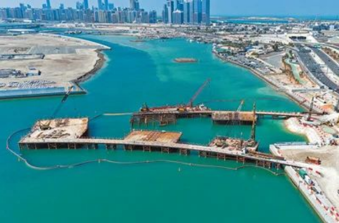 由中国港湾总承包、中交四航局参与实施的阿联酋阿布扎比瑞姆岛7号、8号跨海桥项目,连接瑞姆岛和阿联酋E12高速公路,目前项目施工进展顺利,预计2025年底完工通车,届时将为当地民众提供更加便利的出行条件。