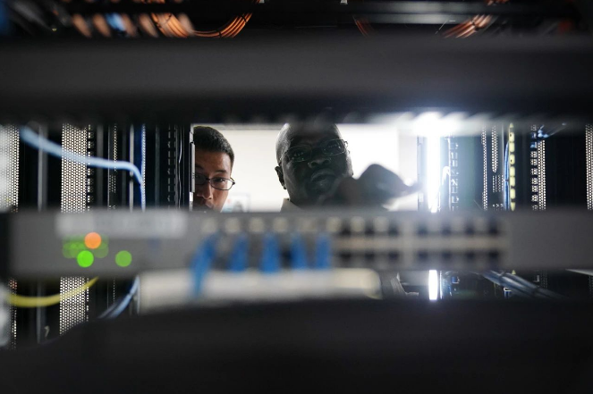 4月9日,在南苏丹首都朱巴,工作人员在南苏丹空中交通管理系统工程项目的空管中心设备机房内调试设备。新华社记者 韩旭 摄
